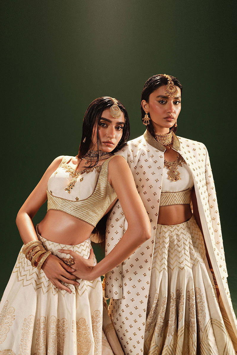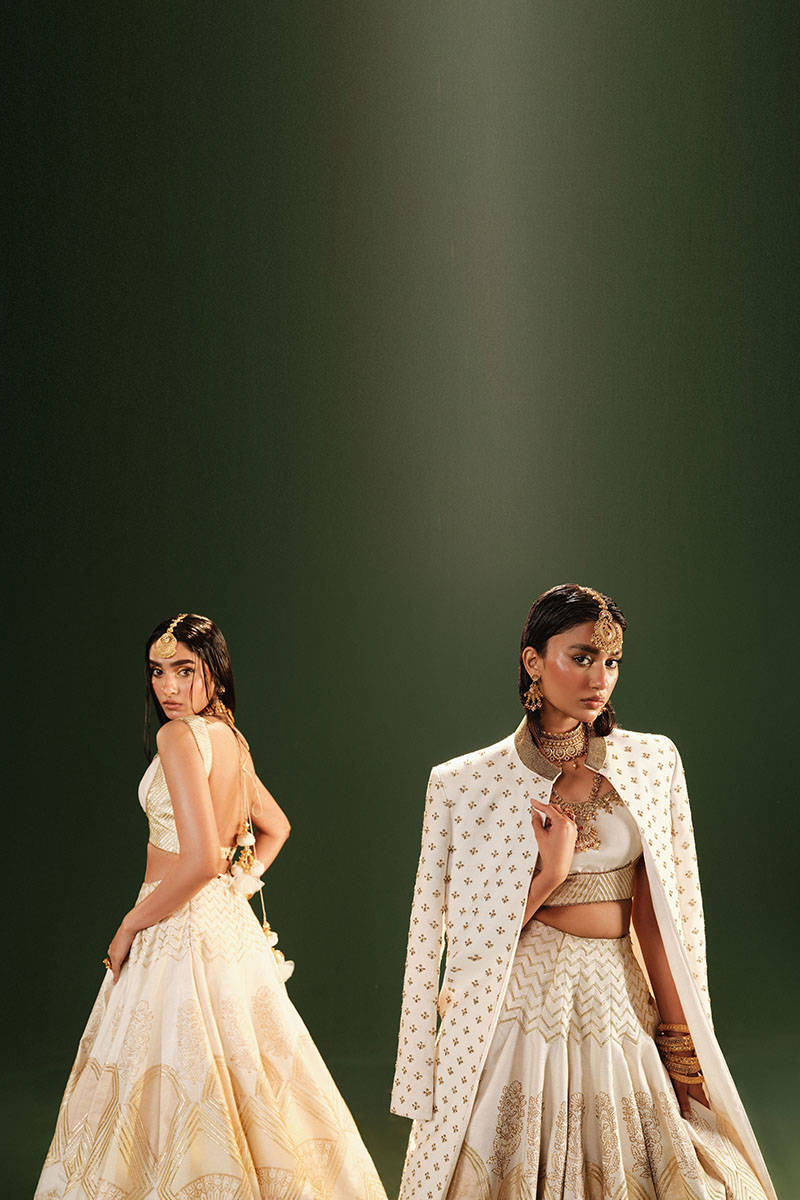 Step into elegance with the Nisa ensemble, showcasing a moti white Indian silk lehenga adorned with two-color appliques, block, and goti, enhanced with trims. The complimenting moti white choli features adda and goti work, while the Kacha tila dupatta with arri, shisha work, and a four-side border enhanced with kiran adds a touch of timeless charm. The gotta trims used here originally derived from the Persian word 'gota,' meaning 'string,' is meticulously handcrafted by artisans, infusing each piece with unparalleled artistry.