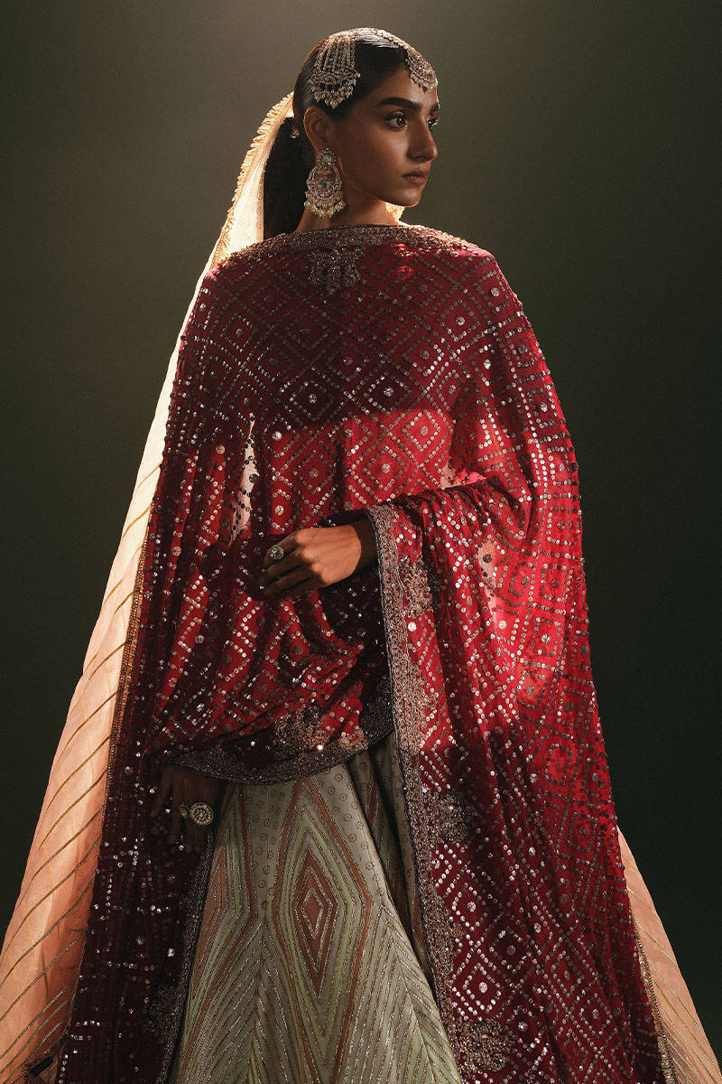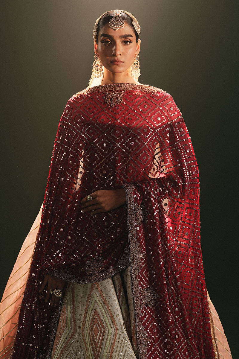 dupatta: Double-tone dupatta with block and goti enhanced with trims.