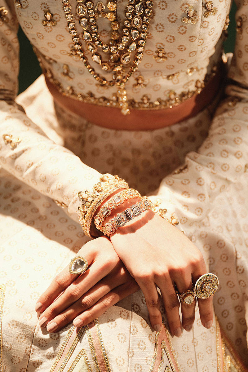 Illuminate the scene with the Ratan ensemble, featuring a chandi-hued lehenga adorned with pink and green appliques, block print, and goti. The Indian silk choli showcases block and adda work, while the double-tone dupatta with block and goti-enhanced trims captures the essence of contemporary regality.