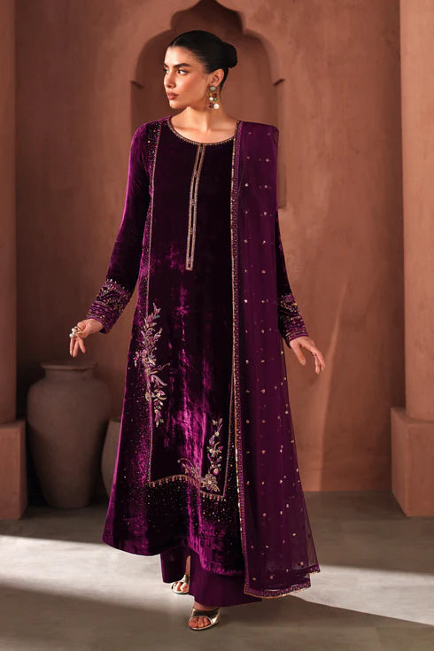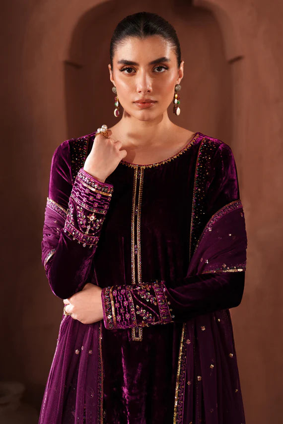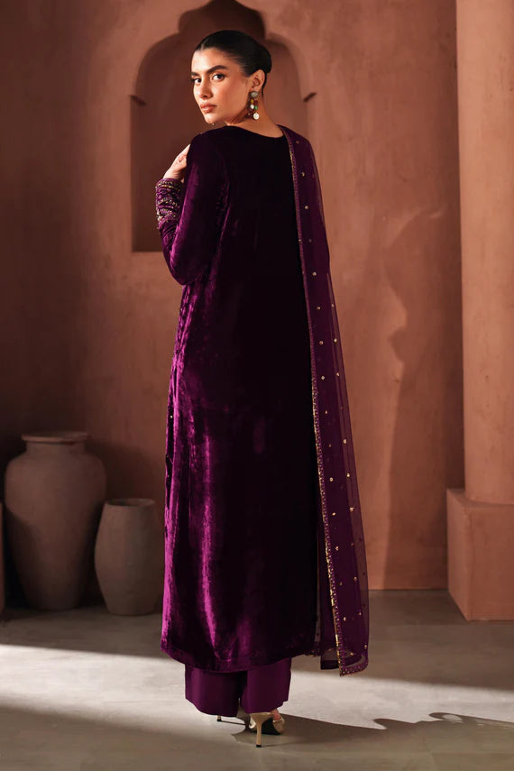 This elegant 3-piece ensemble is crafted in rich pure velvet, designed with refined adda, embroidery, and sequin detailing. The shirt features a graceful straight silhouette with full-length embroidery on the neckline, front panel, and borders, enhanced with intricate m.emb+seq work for a luxurious finish. The sleeves are tailored in a fitted cut, embellished with embroidered borders for a polished look. A soft net dupatta accompanies the outfit, adorned with all-over embroidered and sequin accents, adding a delicate shimmer. The culotte-style trousers are stitched in high-quality raw silk, completing the ensemble with a modern yet traditional appeal. Perfect for winter festivities and semi-formal gatherings, Ramla blends velvet richness with timeless craftsmanship.