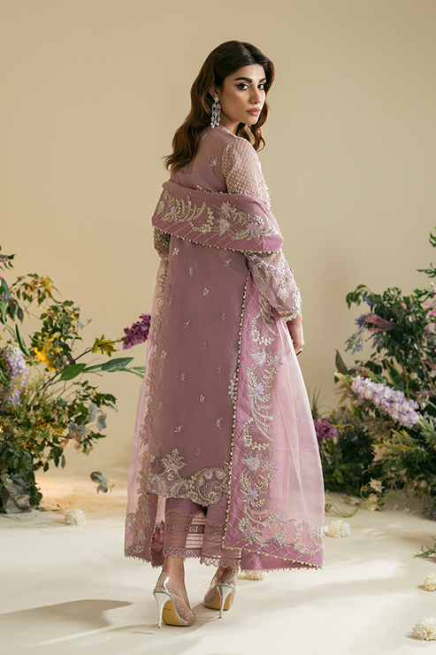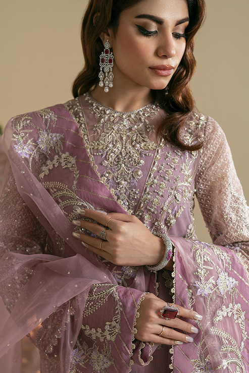 Indulge in the sublime allure of Vasl 24's Maahru creation, a harmony of light pink and lavender hues. The organza shirt and raw silk trousers are a canvas for exquisite embroidery, featuring a rich interplay of pearls, dabka, kiran, stones, Tilla, and meticulous thread work. This luxury formal ensemble is a testament to masterful craftsmanship, elevating your presence with every step. Draped in its celestial beauty, you embody the epitome of poise at any grand affair.