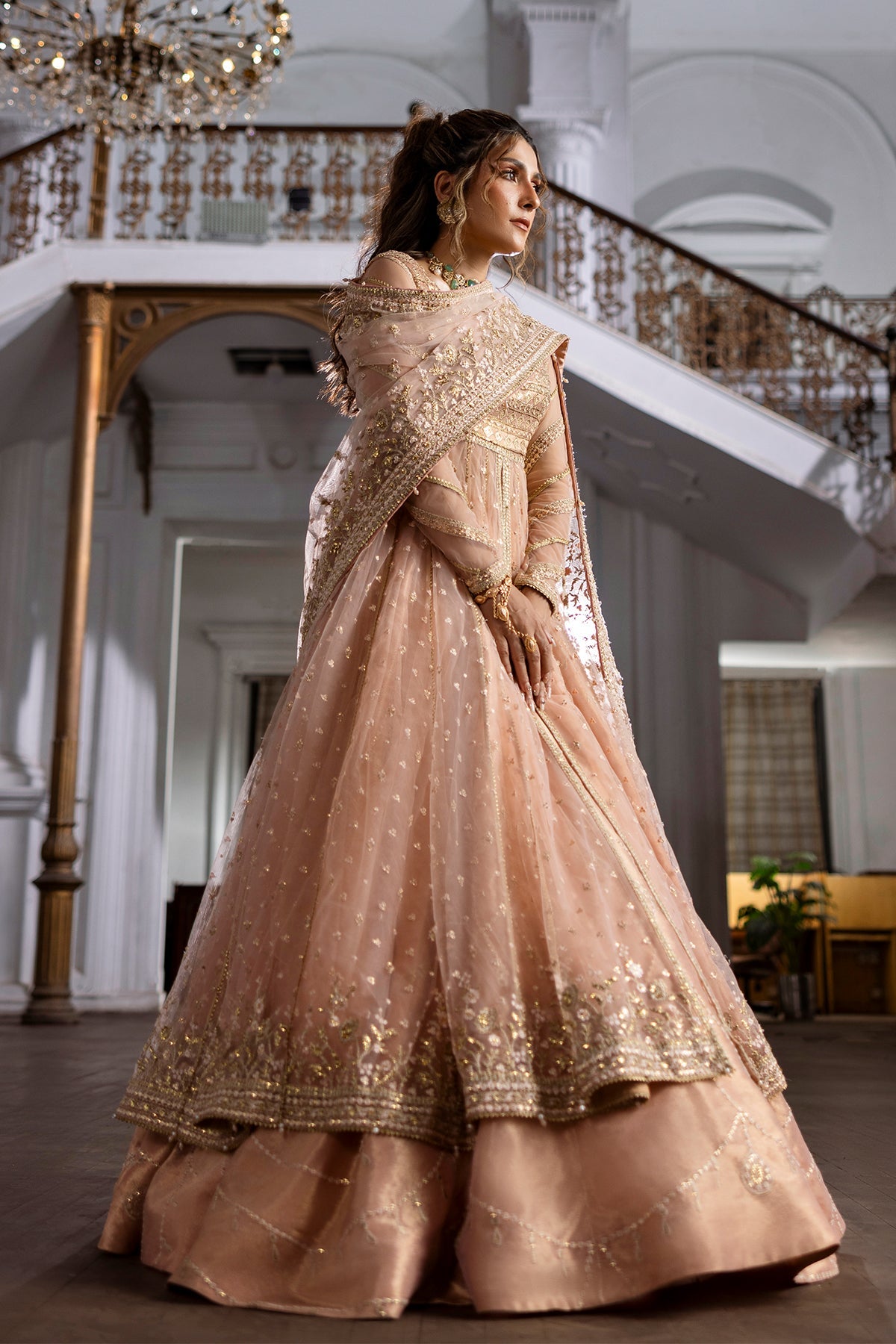 The outfit is a beautiful peach-colored pishwas, paired with a matching blouse and a net dupatta. The pishwas is intricately embroidered with a mix of floral patterns, adding a touch of elegance and sophistication. The tissue fabric used for the Pishwas and Lehnga gives the outfit a luxurious feel, while the net dupatta adds a delicate and airy texture.