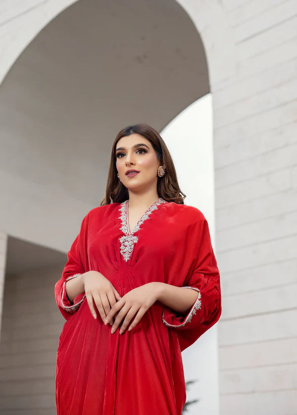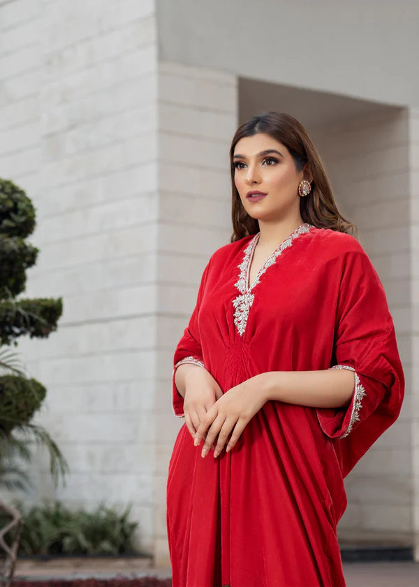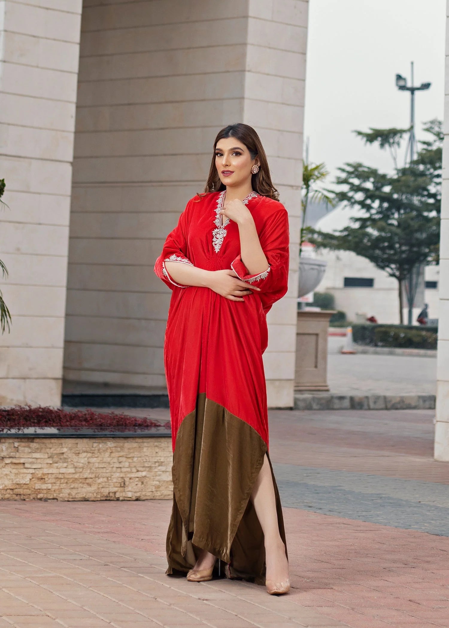Bright coral and taupe colorblock Velvet Kaftan delicately handworked with dabka, nakshi and zardozi on the neckline, shoulder slits and sleeves.