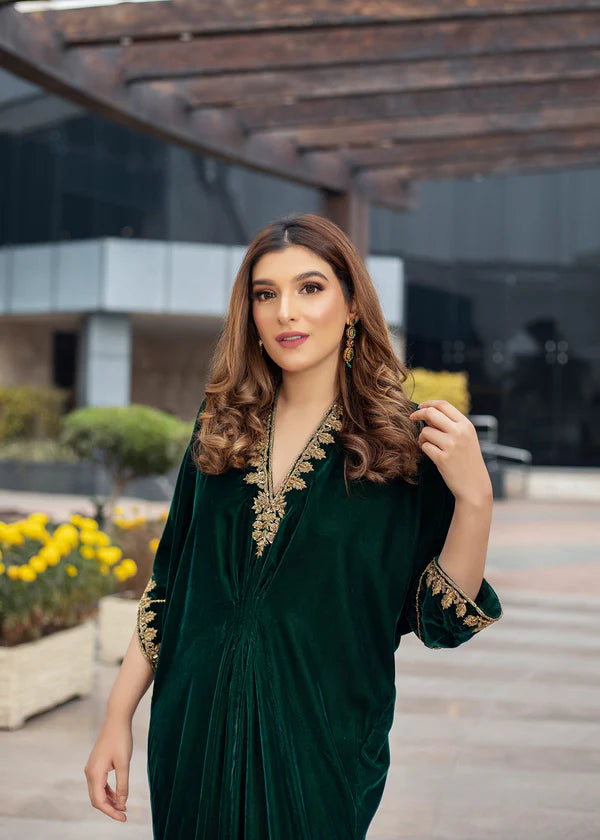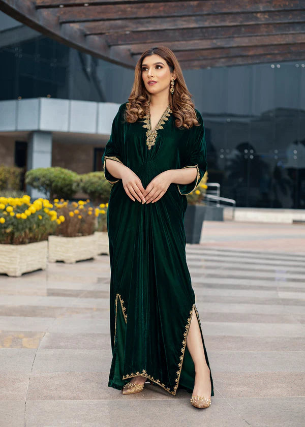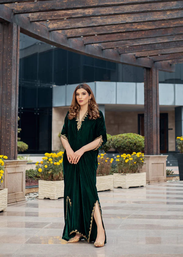 Deep forest green Velvet Kaftan delicately handworked with dabka, nakshi and zardozi on the neckline, shoulder slits, sleeves and front and back hemline and side slits.