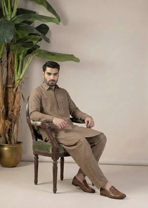 This exquisite Men's Blended Karandi Shalwar Kameez set features a 2-piece ensemble perfect for daily wear. The long kurta top in a rich brown color pairs seamlessly with the loose-fit bottoms, ideal for winter wear. Elevate your wardrobe with this elegant ensemble from Real Image Clothing.