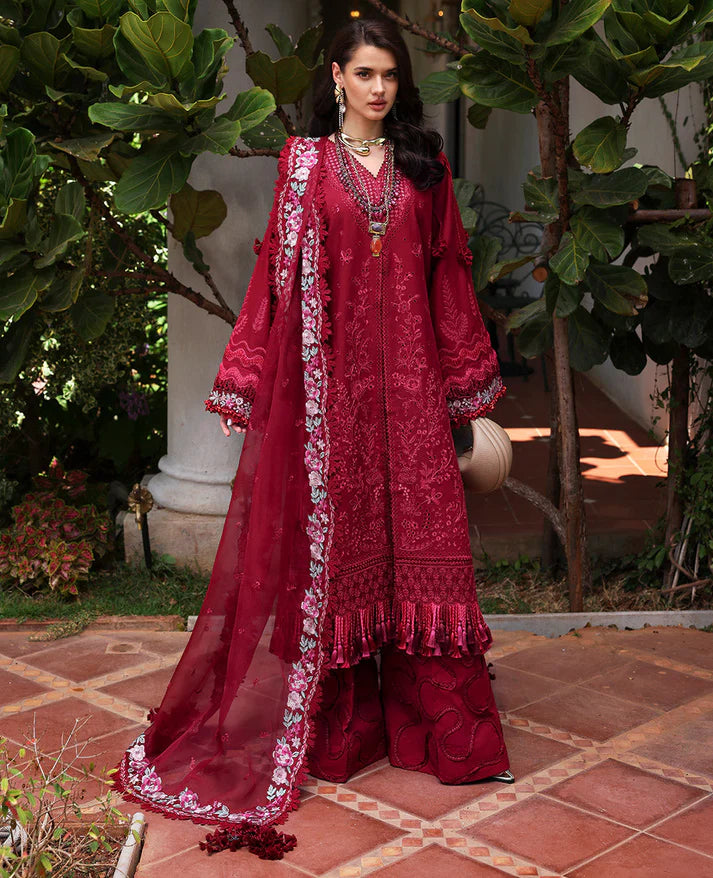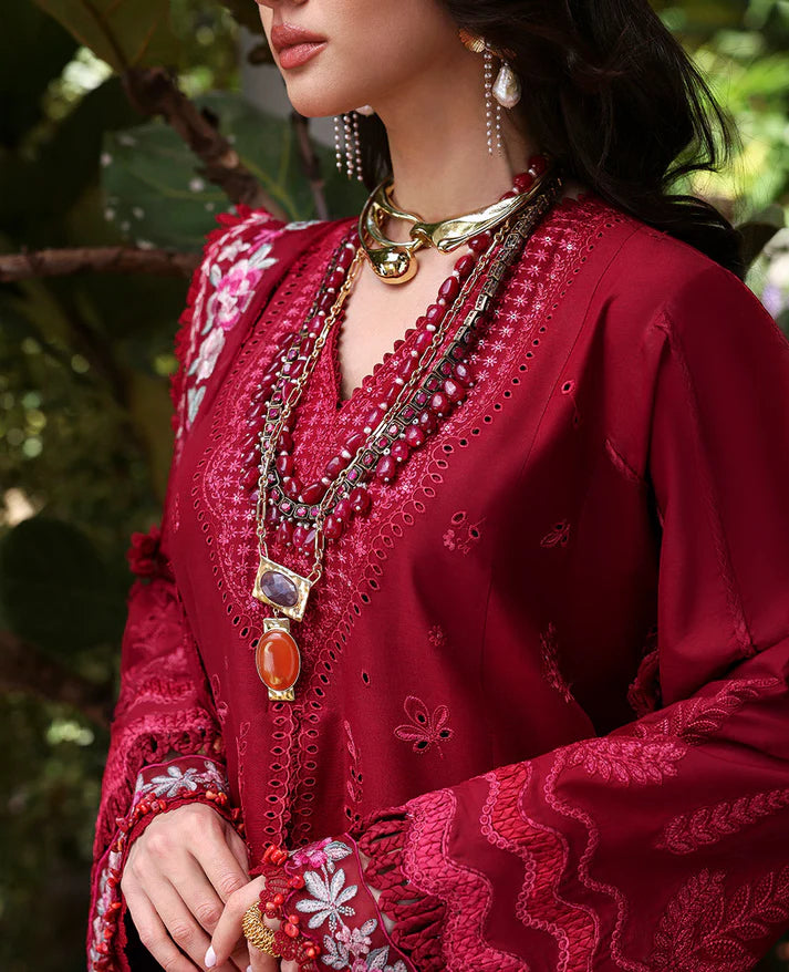 Celebrate Eid in full bloom with ‘Rhea’, a mesmerizing red. This exquisite ensemble features a fully embroidered lawn shirt, adorned with intricate floral patterns that exude timeless elegance. The delicately crafted organza sleeve detailing adds a refined touch, enhancing its ethereal charm within monocolor tone. The look is completed with a beautifully designed organza dupatta, featuring intricate embroidery and elegant finishing, perfectly balancing vibrancy and grace. Paired with tailored cambric trousers, ensuring you make a graceful statement at Eid dinners and celebrations.