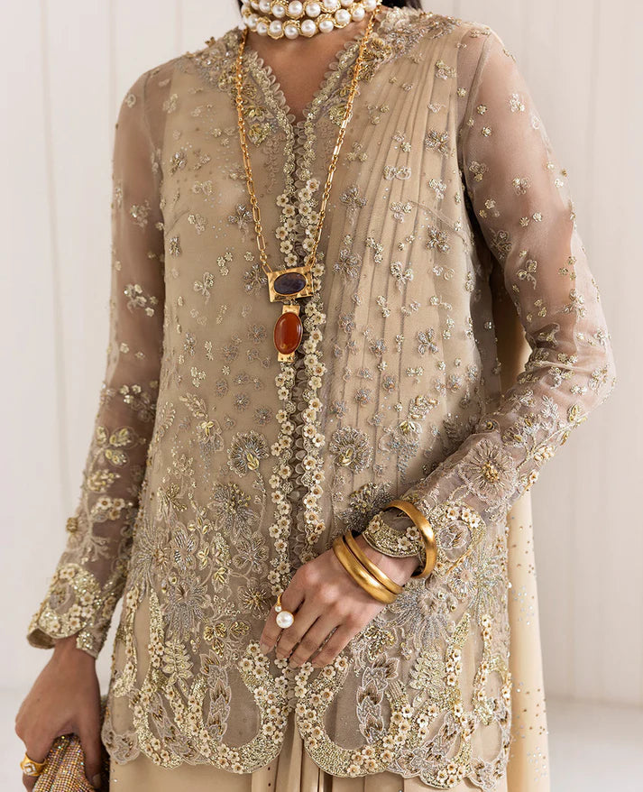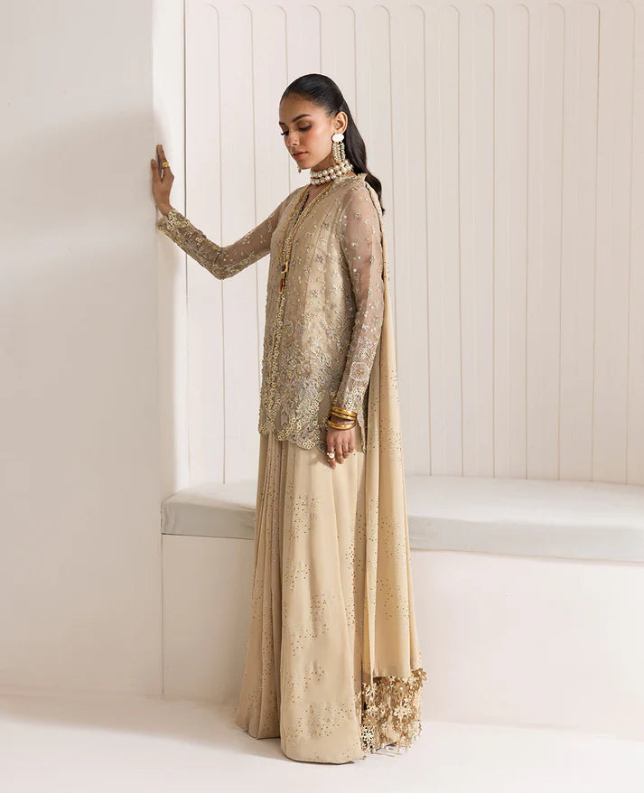 Embodying elegance, Gold is a true testament to the collection. Crafted on luxurious grip and organza fabric, the beige short jacket featuring heavy sequin and stone work along with crystals and beads on top in hues of dull gold. Paired with modern draped inner shirt delicately adorned with beadwork and silk laser cut tassels on back, this ensemble with its refreshing hue, makes a perfect case for understated glam and is sure to become one of your most cherished pieces.