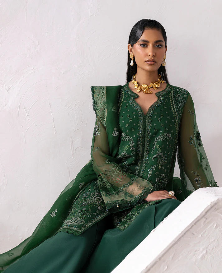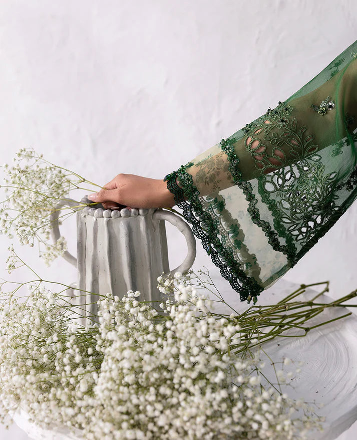 Presenting holly green- a captivating green resham embroidered short organza shirt adorned with intricate print in sleeves and dupatta. The detail on sleeves and handwork in hues of green enhances its beauty. Featuring a regal neckline with petals stitching details, it is gracefully paired with wide leg trouser pants and a luxurious organza dupatta edged with cutwork and lace on four sides.