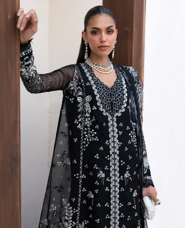 Harnessing high glam, the black dress exudes effortless sophistication. Crafted on an opulent black canvas, the organza front open long shirt dress is adorned with embroidery and hand embellishment detailing such as crystal, stones, bead and laces. Organza dupatta with tie and dye in accent color grey highlights it’s statement. This set includes beautiful crafted wide leg trouser pants with an embroidered patti on the hem, that further elevates the timeless appeal of the outfit, ensuring you stand out wherever you go.