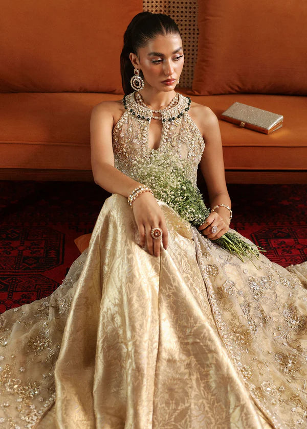 A stylish gold gown featuring signature SFK floral Embrodiery jaal and detailing. Offset by a gorgeous kick of emerald green stone and sparkling crystal embellishment all over the gown. This formal look is styled with a brocade lehnga and a gorgeous fine net gold dupatta that has scalloped handworked edging all around.
