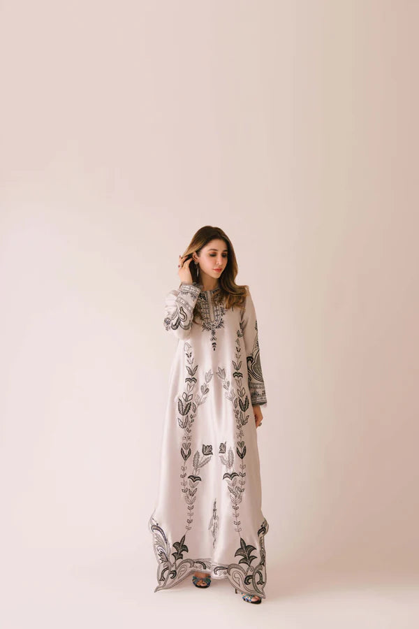 A pure sheesha silk light grey long caftan style shirt with beautiful applique work and embroidery all over the shirt and sleeves. Heavy sequins spray all over the shirt and sleeves. Paired with pure sheesha silk light grey capri pants