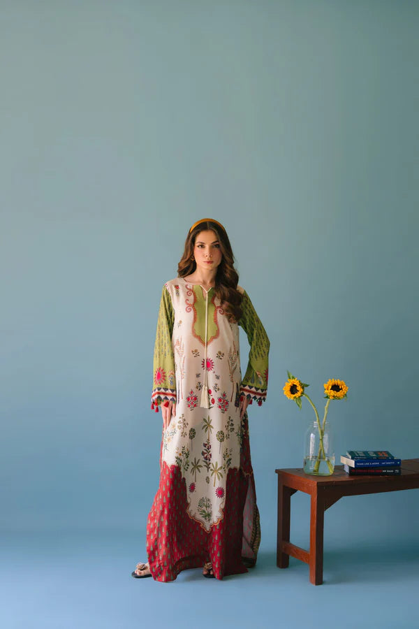 A gorgeous digital print lawn long caftan style shirt with tassel detailing on the neckline. Sleeves have tassels and stone hangings. Paired with a pure plain magenta lawn capri pants.