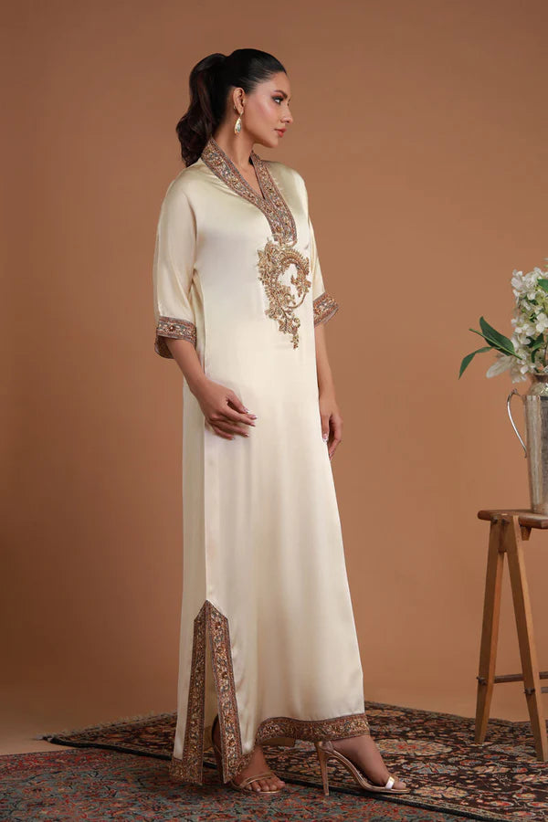 This exquisite coffee-colored kaftan masterfully combines traditional craftsmanship with modern sophistication. The Mughal printed neck patti, adorned with delicate florals and geometric patterns, channels the opulence of India’s Mughal era, adding a regal touch. Intricate machine embroidery enhances the kaftan, creating a textured effect that complements the Mughal-inspired neck design. However, the true highlight is the hand-embroidered motifs on the neck, adding an exclusive, whimsical touch that speaks to artistry and romance. This kaftan is a perfect blend of fusion fashion, making it an ideal choice for formal events, weddings, or any special occasion where elegance is paramount.