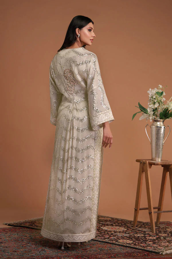 This ivory traditional kaftan ensemble radiates regal charm with its flowing dress, intricate embellishments, and matching dupatta. The dress features a relaxed silhouette adorned with silver sequins and floral and geometric embroidery, creating a blend of traditional and modern design. The neckline is accentuated with beaded detailing, while the long, slightly flared sleeves add sophistication. A structured band at the waist enhances the fit, and the embroidery continues along the hemline for added elegance. The sheer dupatta, with delicate borders, complements the dress’s ethereal look. This refined ensemble, perfect for weddings or festive occasions, combines timeless elegance with contemporary craftsmanship.