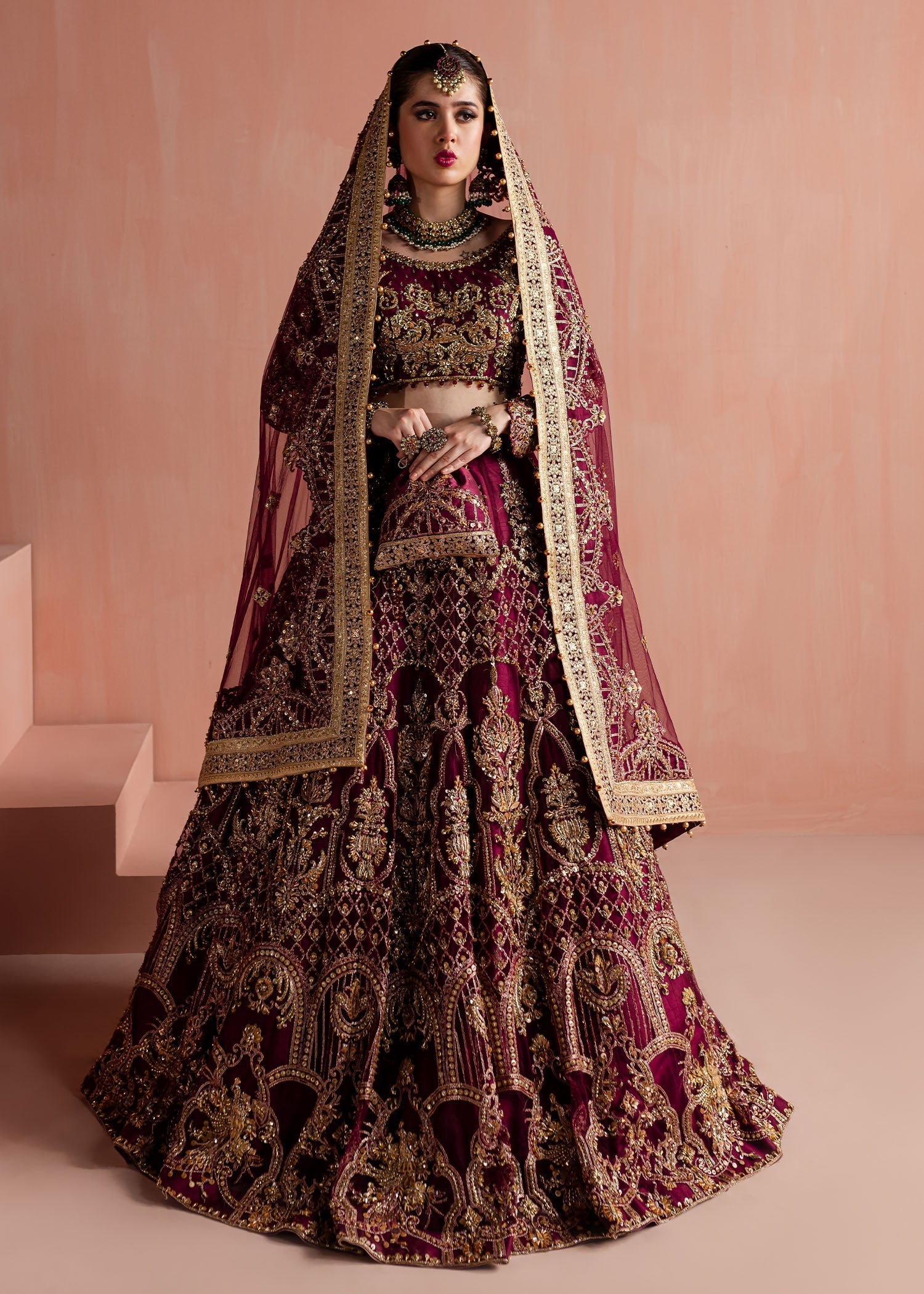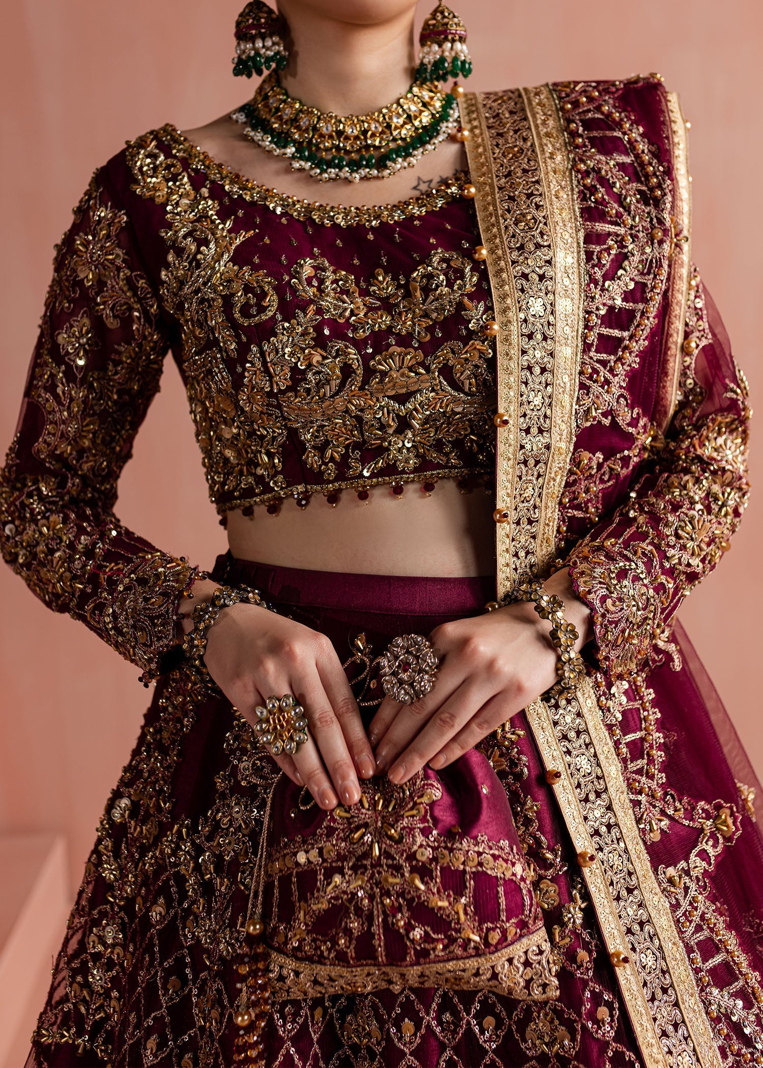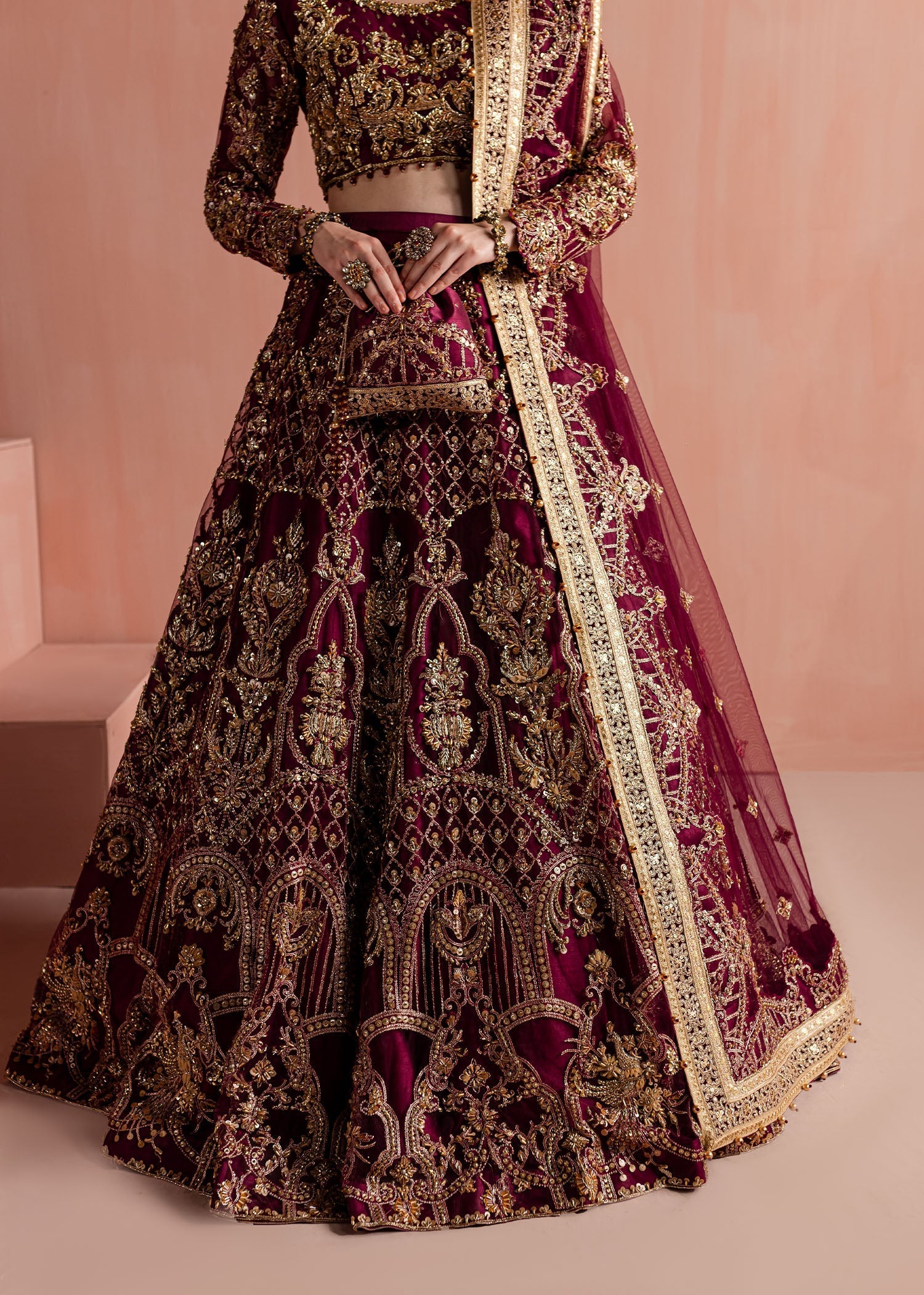 Embedded in royal bliss, ‘Dildaar’ is our regal empress made exclusively on soft maroon net. Tilla embroideries are overlayed with a hand applied golden naqshi, dabka and Swarovski crystal details. This lehnga choli has a beautiful ornate pattern of geometric and floral designs for an ever classic look.