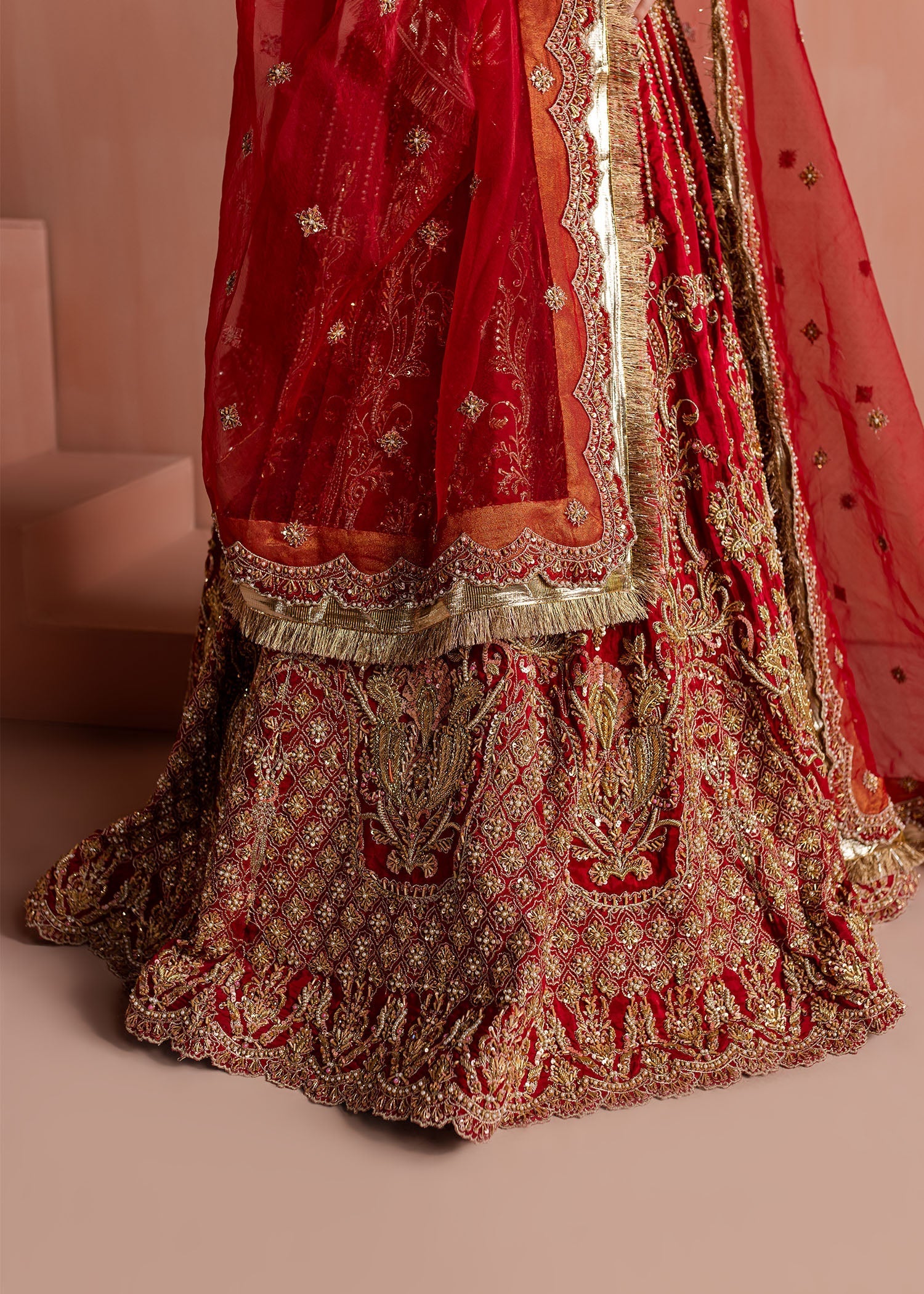 ‘Nazleen’ the empress is our red bridal made with utmost care and love. The silk lehenga choli has traditional motif work along with heavy embellished details of sitara, tilla, dubka, and nukshi for that classic red-gold combination. A modern style organza dupatta gives this regal ensemble that modern flair we want this season.