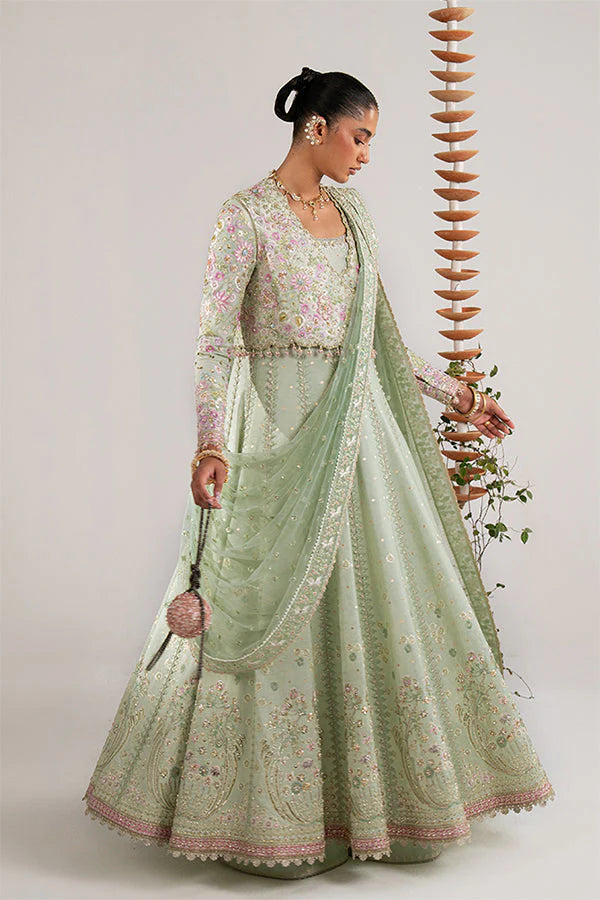 An icy mint jacquard silk pishwas with scoop neck, lace‑detailed panels, embroidered hem, hot pink contrast borders; sleeve options: half or full, both embroidered with tassels (half ends at elbow; full covers arm).