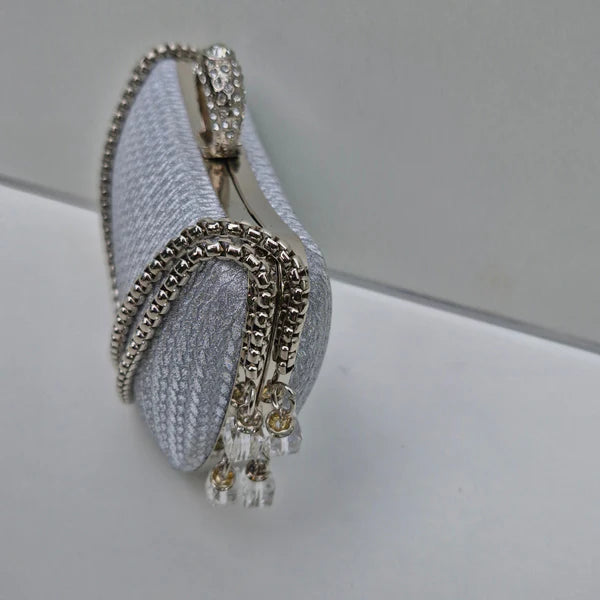 Make an unforgettable statement with this dazzling silver-grey evening bag featuring a unique semi-circular silhouette. The luxurious textured metallic faux leather surface creates depth and dimension, while the stunning crystal-encrusted ring handle serves as both a functional grip and a glamorous focal point. The dual silver-tone beaded chain straps offer versatile carrying options and add an extra touch of sparkle to this show-stopping piece. Key Features: Material: Premium textured metallic faux leather with crystal-embellished silver-tone ring handle and beaded chain straps Design: Distinctive half-moon structured silhouette with dazzling crystal ring handle and elegant dual beaded chains Functionality: Secure top closure with crystal ring handle and dual carrying options with detachable beaded chains Occasion: Perfect for cocktail parties, formal galas, wedding receptions, upscale dinners, and glamorous evening events Presented in a BEAUTIFUL GIFT PACKAGING
