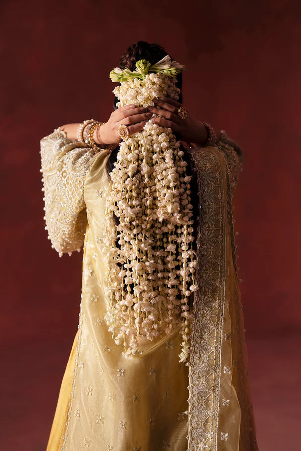 Radiate festive charm in our Yellow 3-Piece Pret Ensemble, exquisitely tailored in luxurious Korian Silk for both the shirt and lehenga. The fully embroidered shirt features delicate adda work paired with elegant net fabric appliqués, while the round neckline sparkles with embellished edging and playful pearl-hanging tassels. Chic cape-style embroidered sleeves add a modern flair, enriched with intricate adda detailing. The voluminous flared lehenga boasts a heavily embroidered hem, beautifully finished with pearls along the edge for a graceful, luminous touch. Completing the look, the bareeze net dupatta is adorned with an all-over embroidery spray and four-sided embroidered borders, creating a perfectly polished festive silhouette.