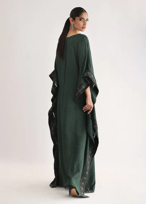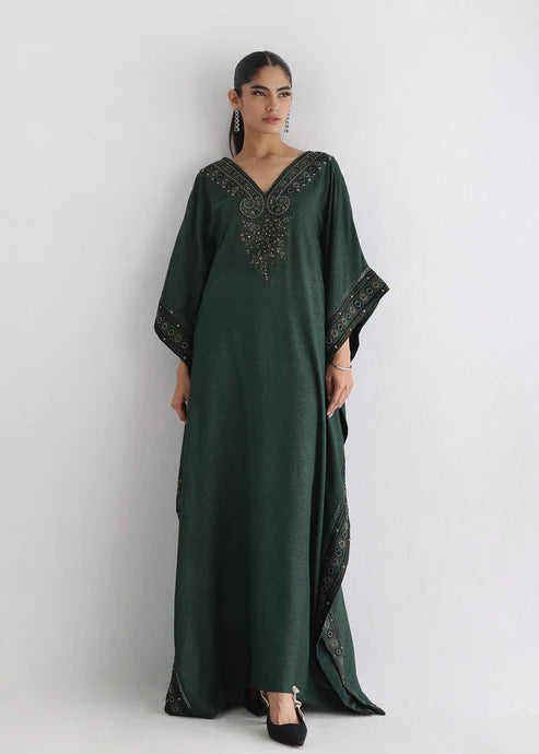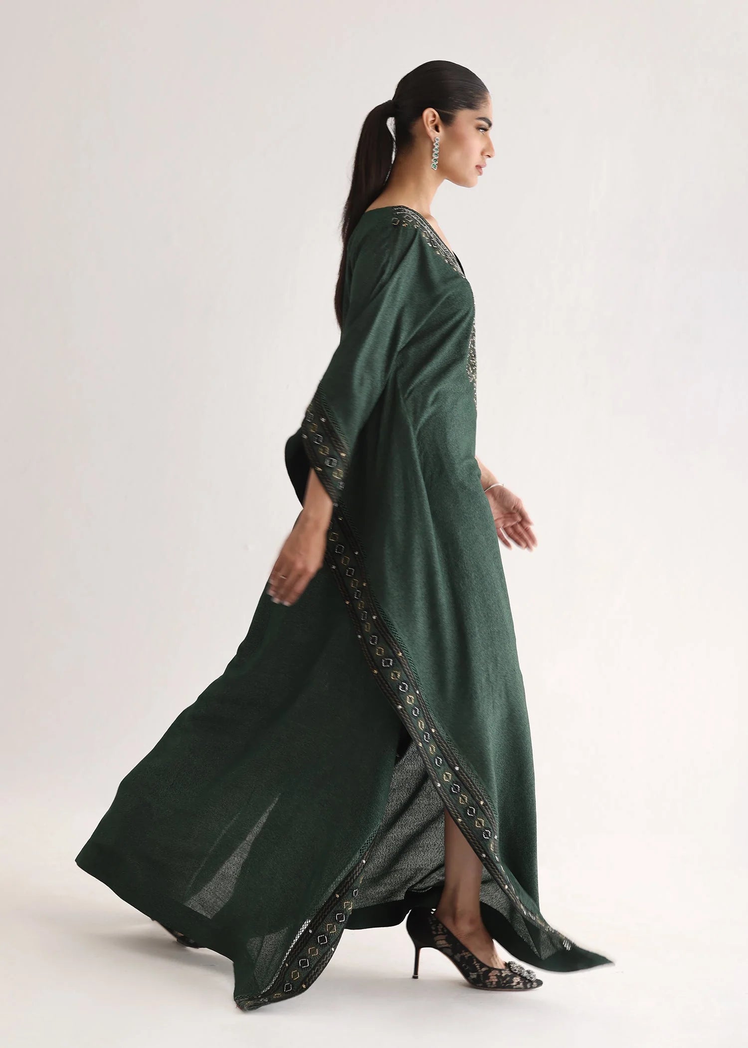Introducing our exquisite pure Karandi silk Kaftan in lush Jade. Adorned with intricate embroidery and embellishments on the neckline and sides, accented with delicate cut-daana detailing. Paired with silk straight pants with lace details on hem.
