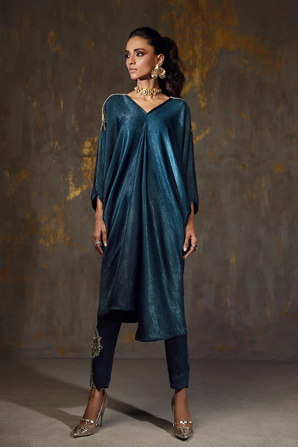 Embrace luxury with this formal drape top, intricately embroidered with zardozi, crystal, and chain details. Paired with embroidered motif pants to create a look that exudes elegance and sophistication. Effortlessly stunning.