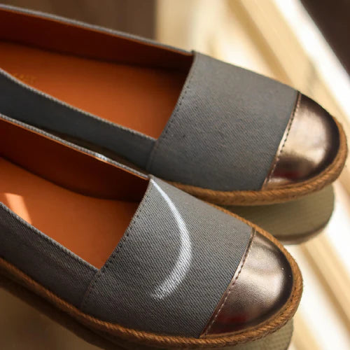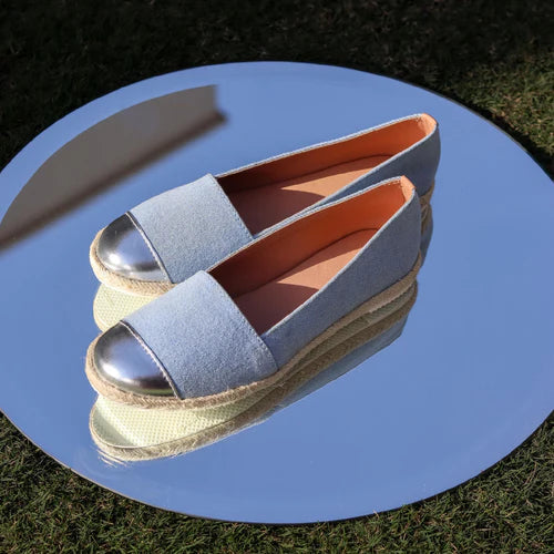 Elevate your casual look with our espadrille-inspired denim loafers. Every step feels like a breeze in these super light Winona Loafers. Maintaining the exclusivity, each pair is unique and one of a kind. With skilled craftsmen behind each pair’s fabrication process, from shoe making, design sketching to hand-work, JootiShooti promises to be a treat for your feet. -Details: - Upper: Denim; - Foot bed: PU Leather; - Sole: Rubber and Cushioned in-sole - Anti-slip sole Handcrafted in Pakistan. All our pairs are sourced and crafted in Pakistan by a team of artisans. Care: Super easy to clean! Wipe with a slightly damp cloth to clean off any dust. Disclaimer: Product color may vary due to lighting, screen pixel and color settings. Packaging: Comes in shoe protecting bag and a box*.