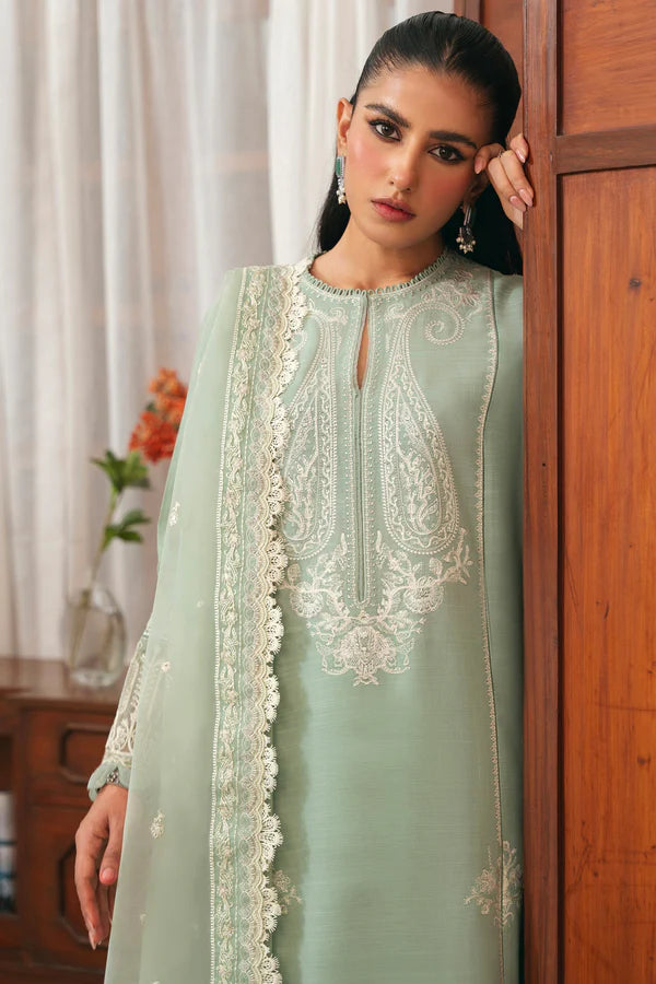 Introducing “Chandni” – A soft, ethereal masterpiece in glacial green, where delicate ivory embroidery caresses the fabric like whispers of a forgotten dream. The serene paisleys flow gently across the silhouette, with a beautifully detailed neckline that seems to capture the stillness of a winter evening. Each intricate stitch of the festoon weaves a tale of quiet grace, exuding a feminine allure that reflects the tranquil melancholy of autumn’s last breath.