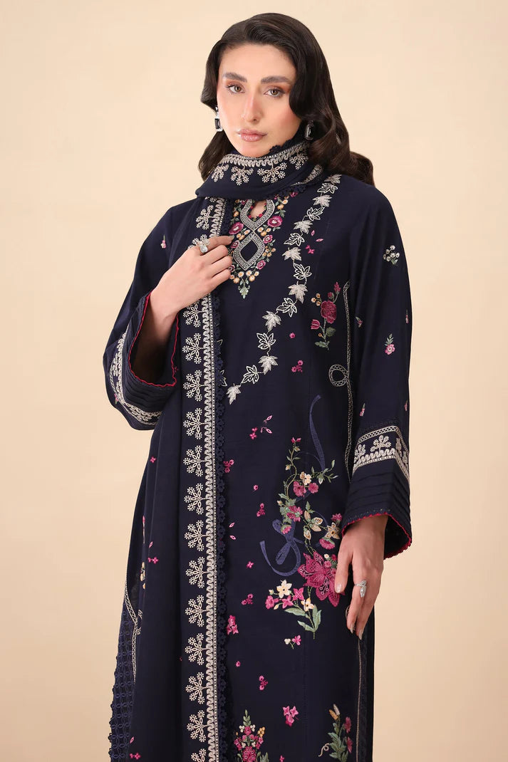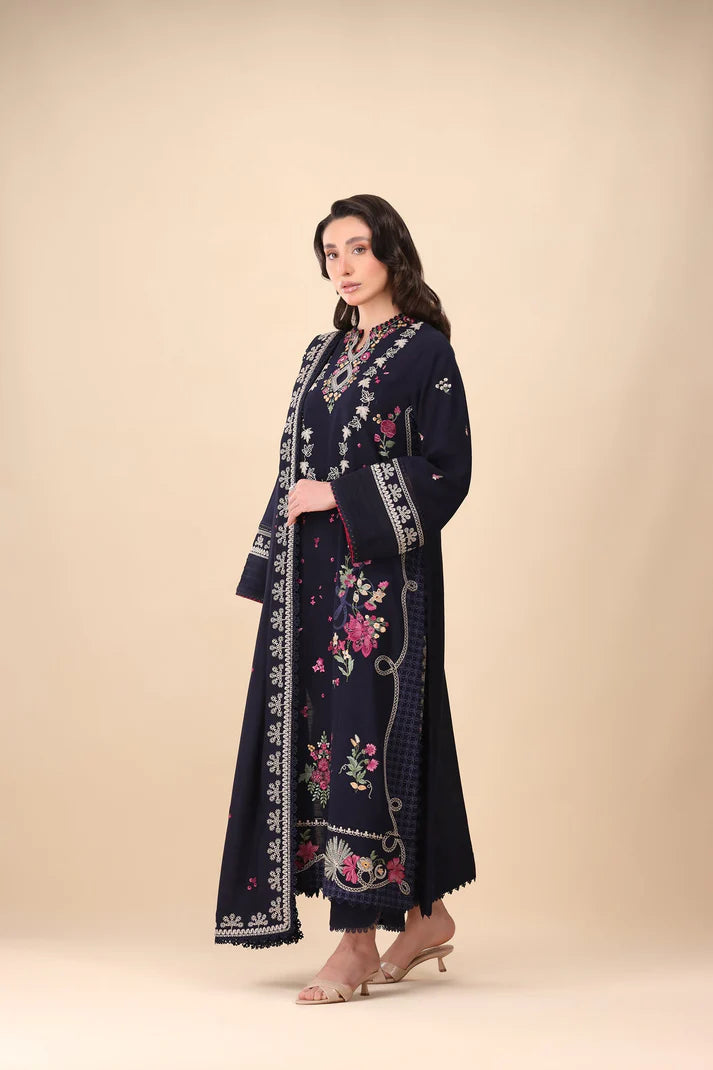 Luna - Indulge in the elegance of winter nights with this opulent midnight blue ensemble, beautifully embellished with intricate floral motifs in deep pink, magenta, and ivory. The rich, deep hues and exquisite embroidery exude timeless luxury, making it the perfect choice for an unforgettable winter dinner.