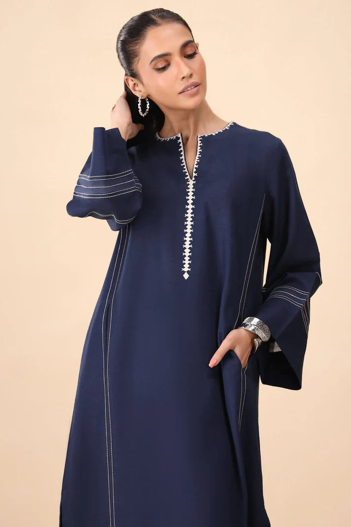 Embrace the season in style with Nocturne, a chic, flowing long shirt in a rich midnight blue that radiates effortless elegance. Featuring functional pockets and delicate ivory thread detailing, this piece is elevated by an embroidered neckline that adds just the right amount of sophistication.