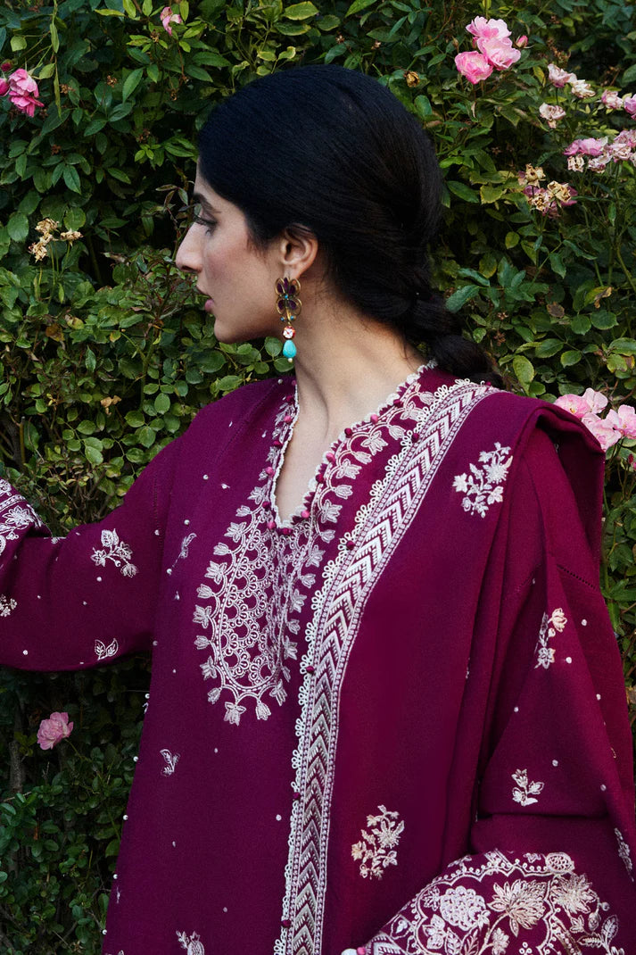Afreen" unfolds like a winter dream, its lush magenta canvas adorned with ethereal ivory chintz embroidery that whispers of timeless elegance. This luxurious khaddar ensemble—a warm, textured shirt and trouser—wraps you in a cozy embrace, perfect for the season’s cooler days. Delicate floral vines, enchanting birds, and pomegranate motifs bloom like a vintage winter garden, evoking an otherworldly charm against the berry-hued fabric.