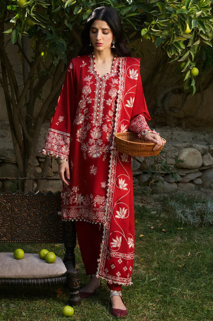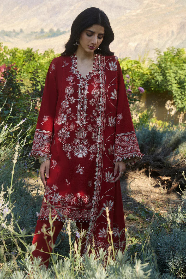 Immerse yourself in the winter romance of "Dilara," where delicate floral motifs in shades of ivory, rust, and deep crimson bloom across a luxurious crimson red canvas. Like a winter garden kissed by twilight, intricate florals cascade along the neckline, radiating warmth and sophistication. Paired with a tonal karandi dupatta adorned with an exquisitely embroidered floral border, "Dilara" captivates under both soft daylight and evening starlight. This enchanting ensemble wraps you in a vision of winter’s beauty, promising an unforgettable look that transitions effortlessly from day to night, embodying elegance and grace.