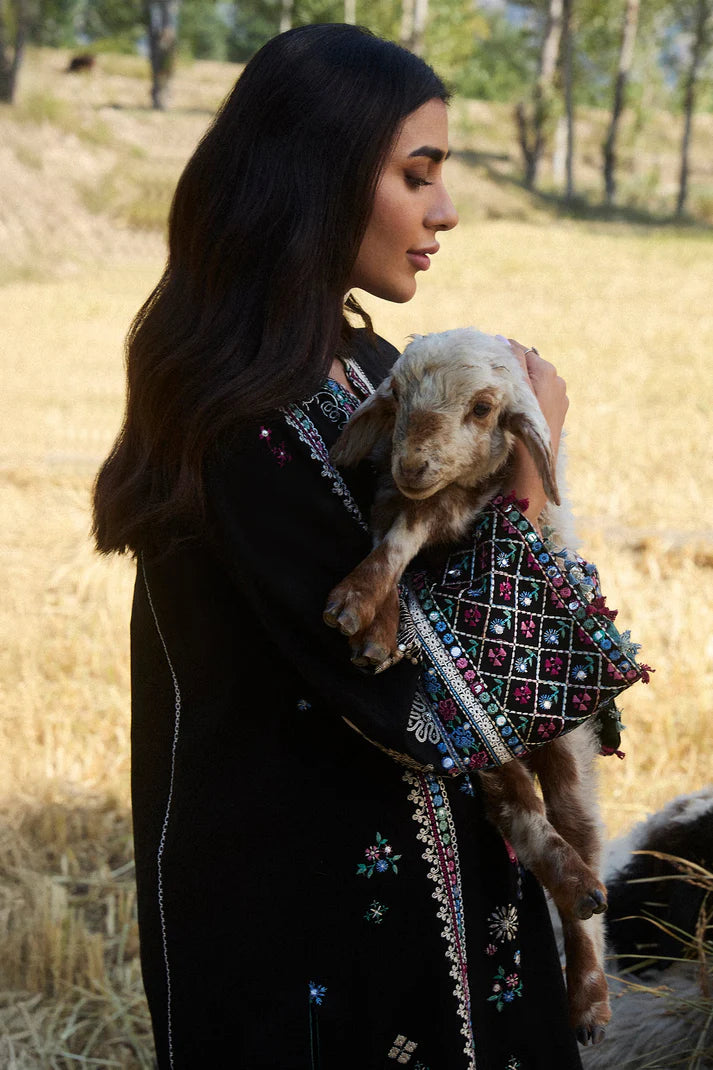 Hazan’ is a winter’s day captured in an ethereal embrace, where the smoldering ebony hue meets the gentle caress of winter sunlight. The intricate florals, embroidered with ivory, rich plum, azure, moss, and sage, shimmer as the sun’s rays filter through, casting a soft, golden glow across the design. Each stitch of marori tribal embroidery and delicate pani work tells a story of heritage, unfolding like the first light of dawn on a crisp winter morning. The sunlight dances across the fabric, highlighting the detailed patterns with a soft, dreamy glow that feels like a winter fairy tale. The beautiful embroidered sleeves, delicately adorned with the intricate ethnic motifs, add a refined touch of artistry, as if the fabric itself tells a story. Complemented by a tonal karandi shawl, its borders embroidered to perfection, Hazan radiates an otherworldly charm—elegant, serene, and beautifully grounded in the magic of winter’s light.