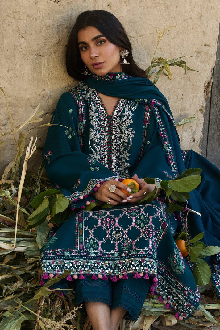 Introducing Zumar,an enchanting fusion of deep, opulent teal and the timeless artistry of tribal heritage, meticulously crafted for the winter season. This exquisite ensemble is fashioned from sumptuous khaddar, adorned with intricate ivory, berry, and moss embroidery that draws inspiration from the ancient motifs of tribal cultures. The bold geometric designs and delicately embroidered borders evoke a sense of rugged elegance, while the rich, wintery hues infuse the ensemble with warmth and depth. Paired with a luxurious karandi dupatta, Zumar effortlessly blends cultural richness with contemporary refinement, creating an ethereal, dreamlike allure. This masterpiece strikes the perfect balance between timeless tradition and the sophisticated elegance of the Zaha woman, enveloping the wearer in both comfort and unparalleled luxury for the colder months.