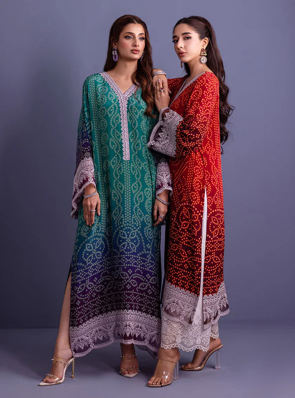 Adding a contemporary twist to the ensemble is the Pure Silk kaftan, adorned with a mesmerizing digital chunri ombre print in shades of teal and purple. Crafted from organza fabric, the long shirt boasts an embroidered border along the sleeves and daman, adding a touch of opulence and sophistication. The embroidered neck pati further enhances the neckline, exuding elegance and charm.