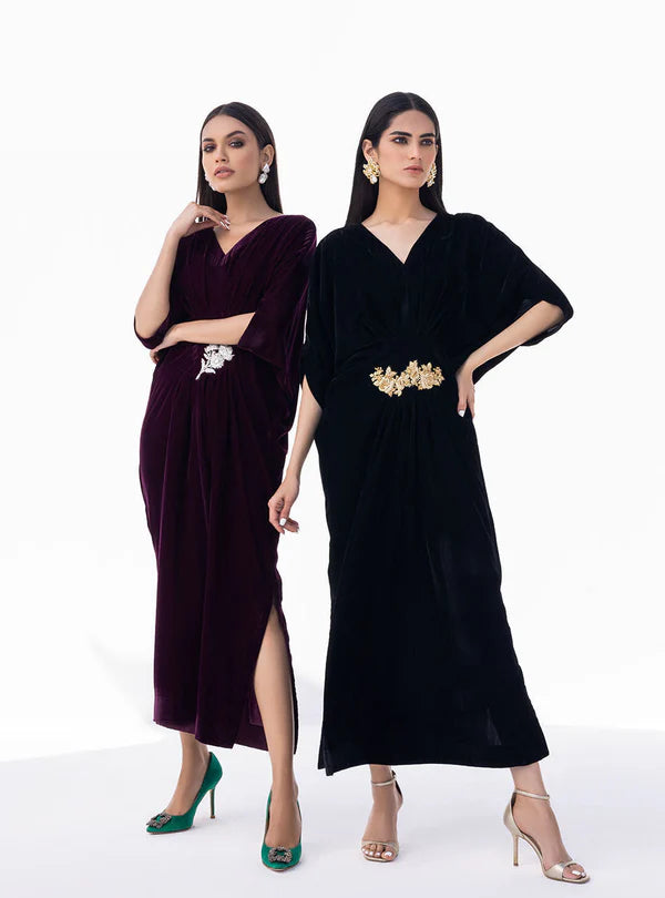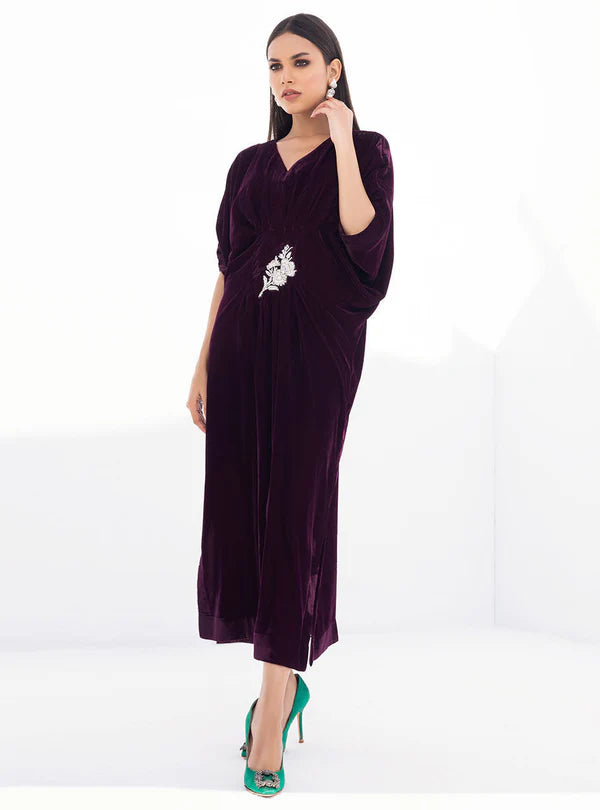 This brilliant plum velvet kaftan will elevate your evenings. This ensemble has a flattering look thanks to the beautiful v-neckline. A lovely hand embroidered pattern is added to finish the design.