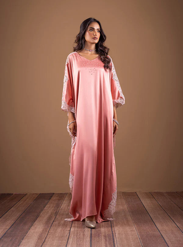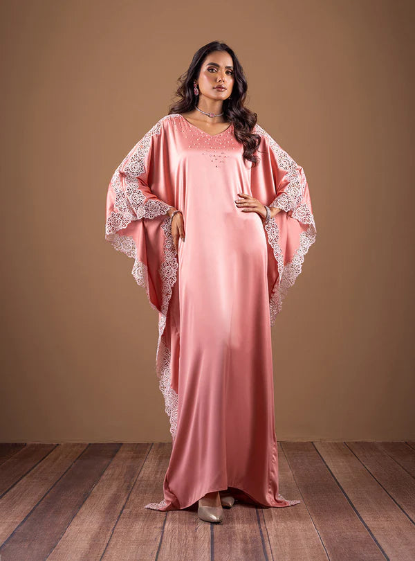 Embellished with subtle yet intricate detailing this silk kaftan in a tea pink color adds an extra touch of allure elevating its beauty to new heights.