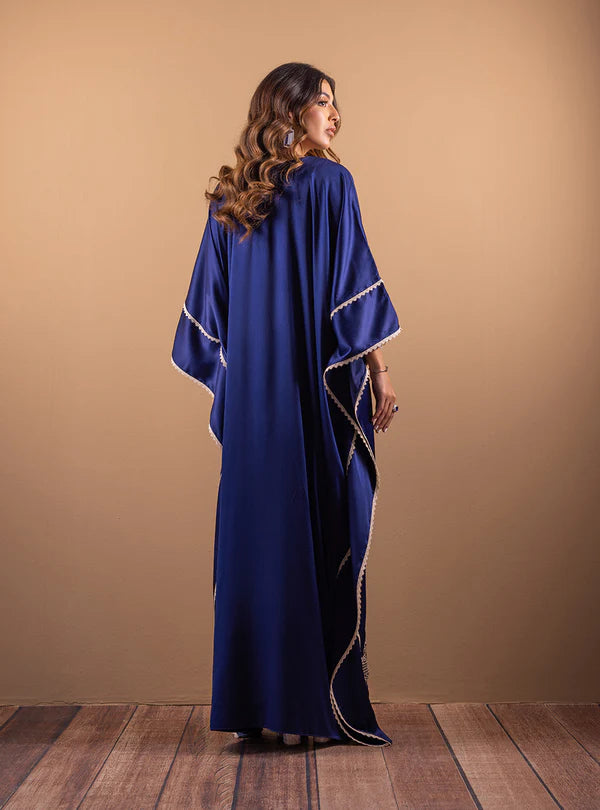 Step into sophistication with this royal blue ensemble featuring intricate hand worked embroidery on the daaman (hem) and on the neck line. The shamose silk kaftan epitomizes elegance, and gracefully enhances your silhouette.