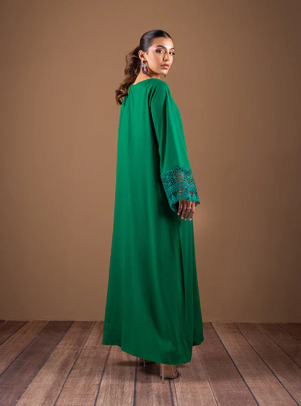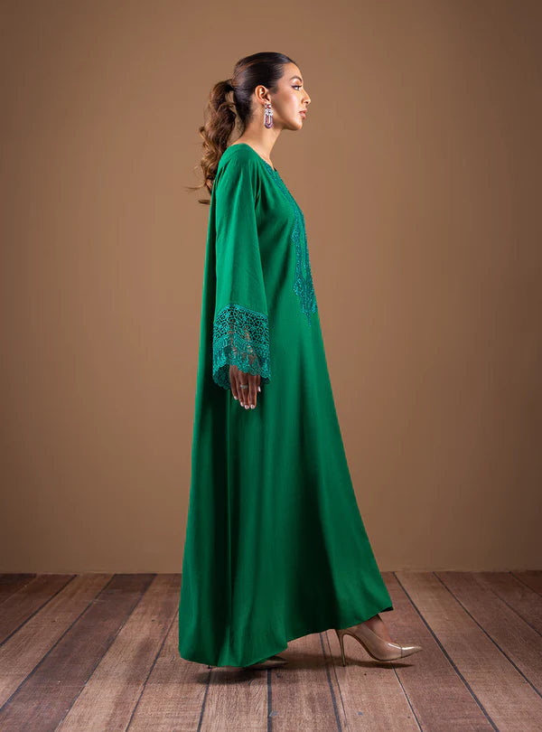 The flowy silhouette in a green color drape gracefully over the body, creating an ethereal and enchanting aura. Its billowing sleeves and relaxed fit exude an air of effortless sophistication, ensuring both comfort and style with every step. The rich green hue of the fabric is a tribute to nature's abundance, evoking a sense of tranquility and harmony. Whether worn for a formal occasion or a casual outing, this kaftan radiates with timeless beauty and understated glamour.